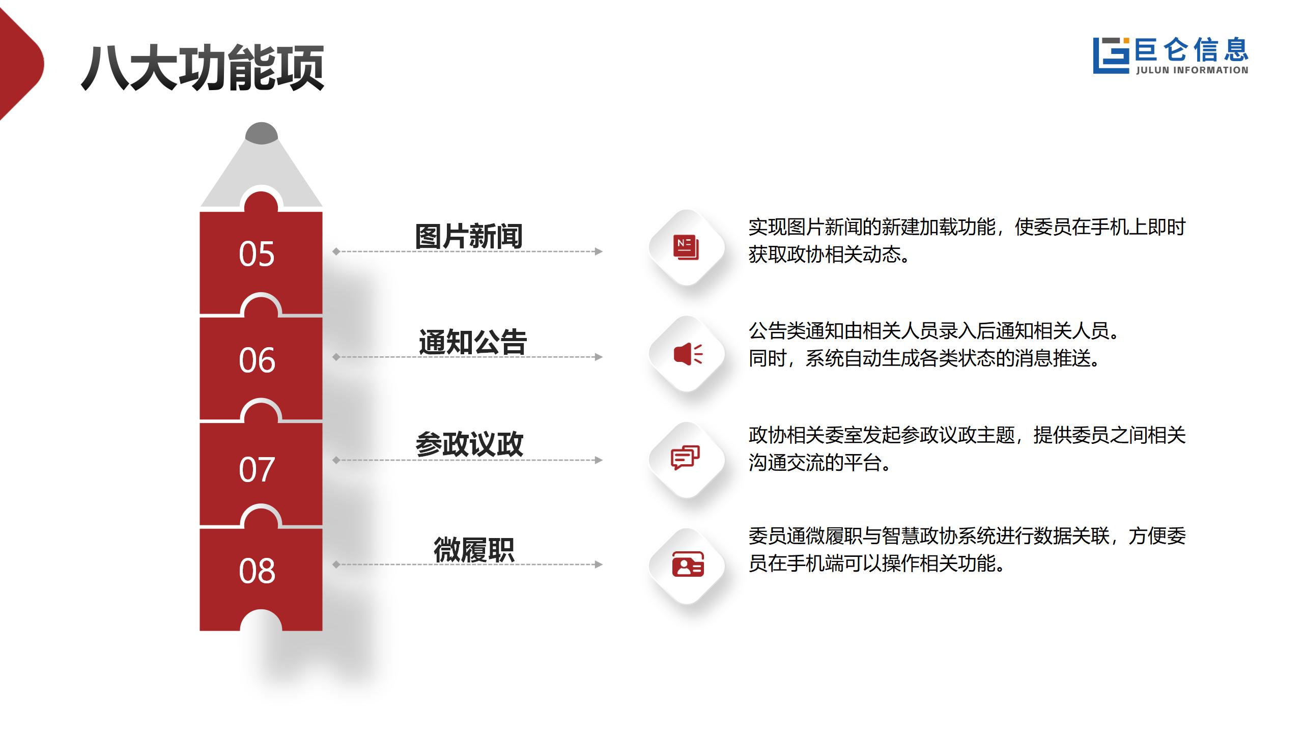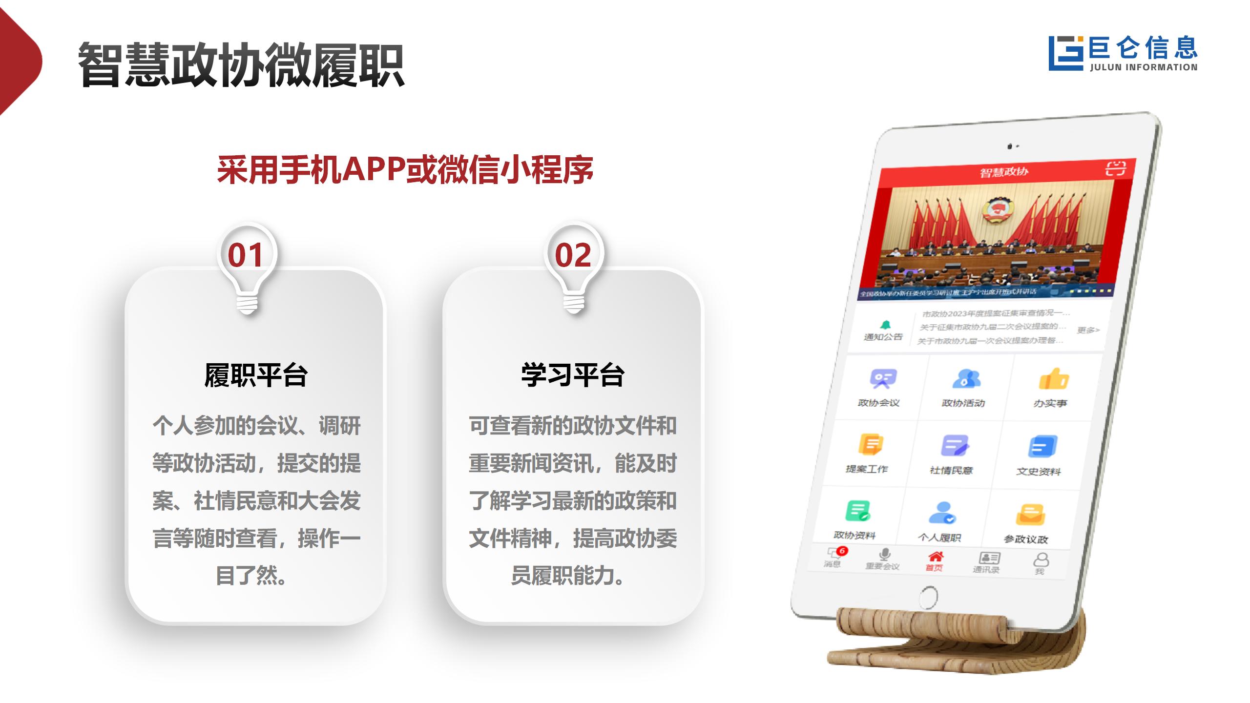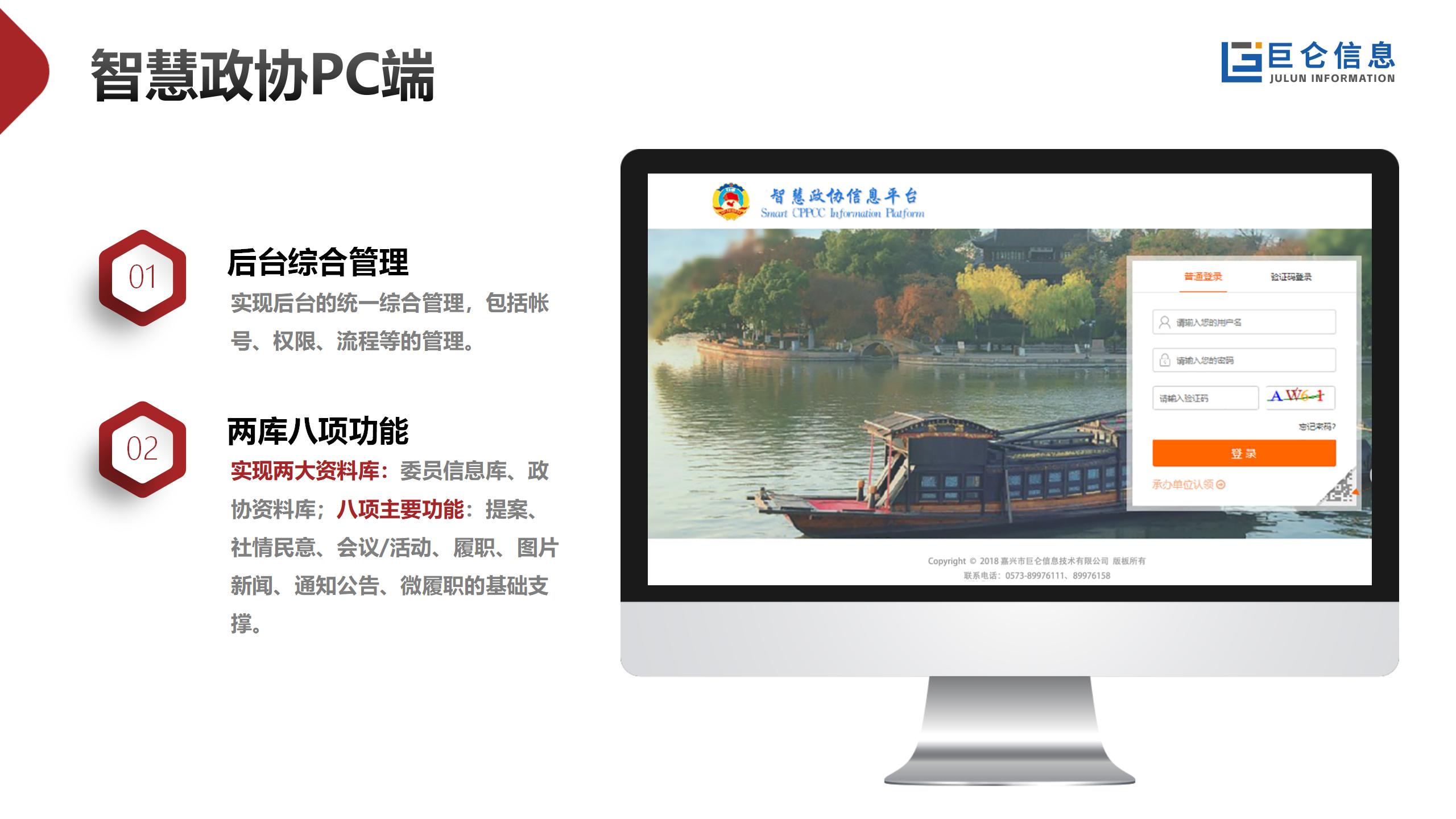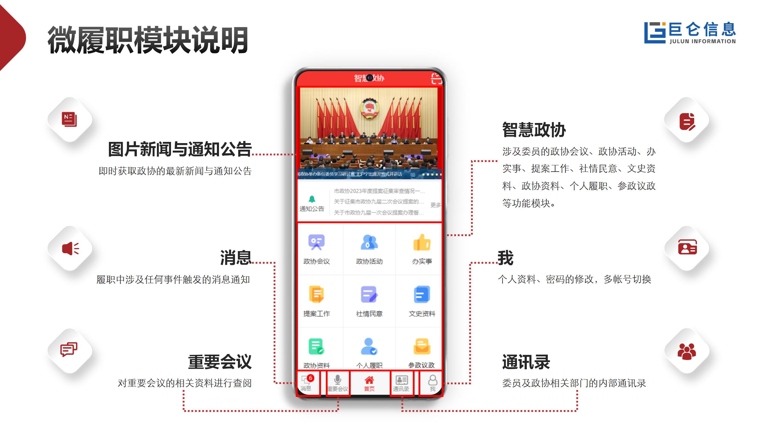 智慧政协系统是政协工作数字化核心平台,以“赋能履职、高效协商、安全可控”为核心,实现了政协委员的履职管理与政协部门的日常工作管理,为委员搭建知情明政、参政议政的新平台,全方位提升了政协工作效率与管理水平。