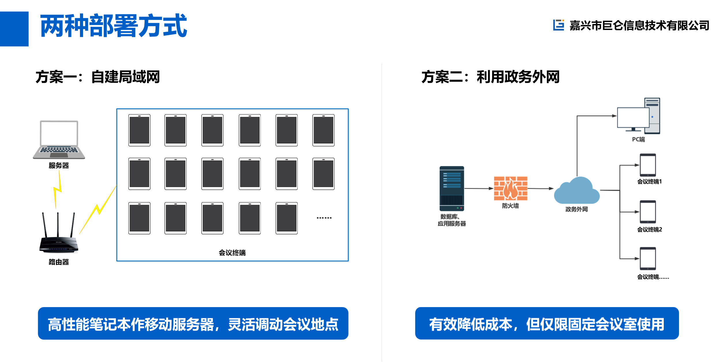 系统有两种部署方式,各有优点,我们首推方案一:自建局域网。这种方式会议部署方便,场地灵活性高,使用于大多数场景。