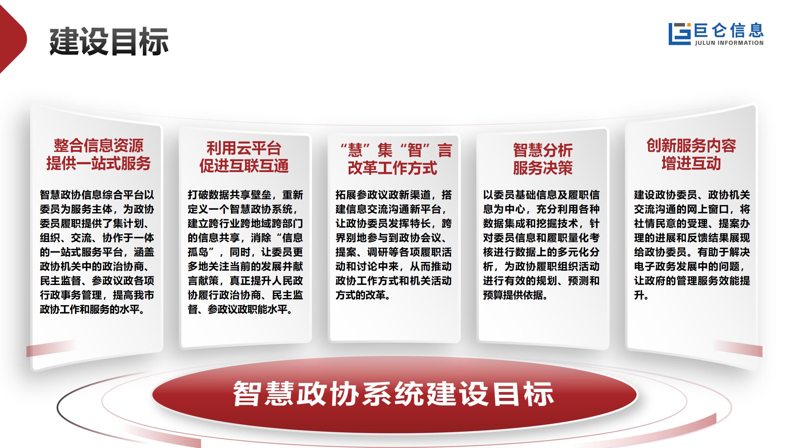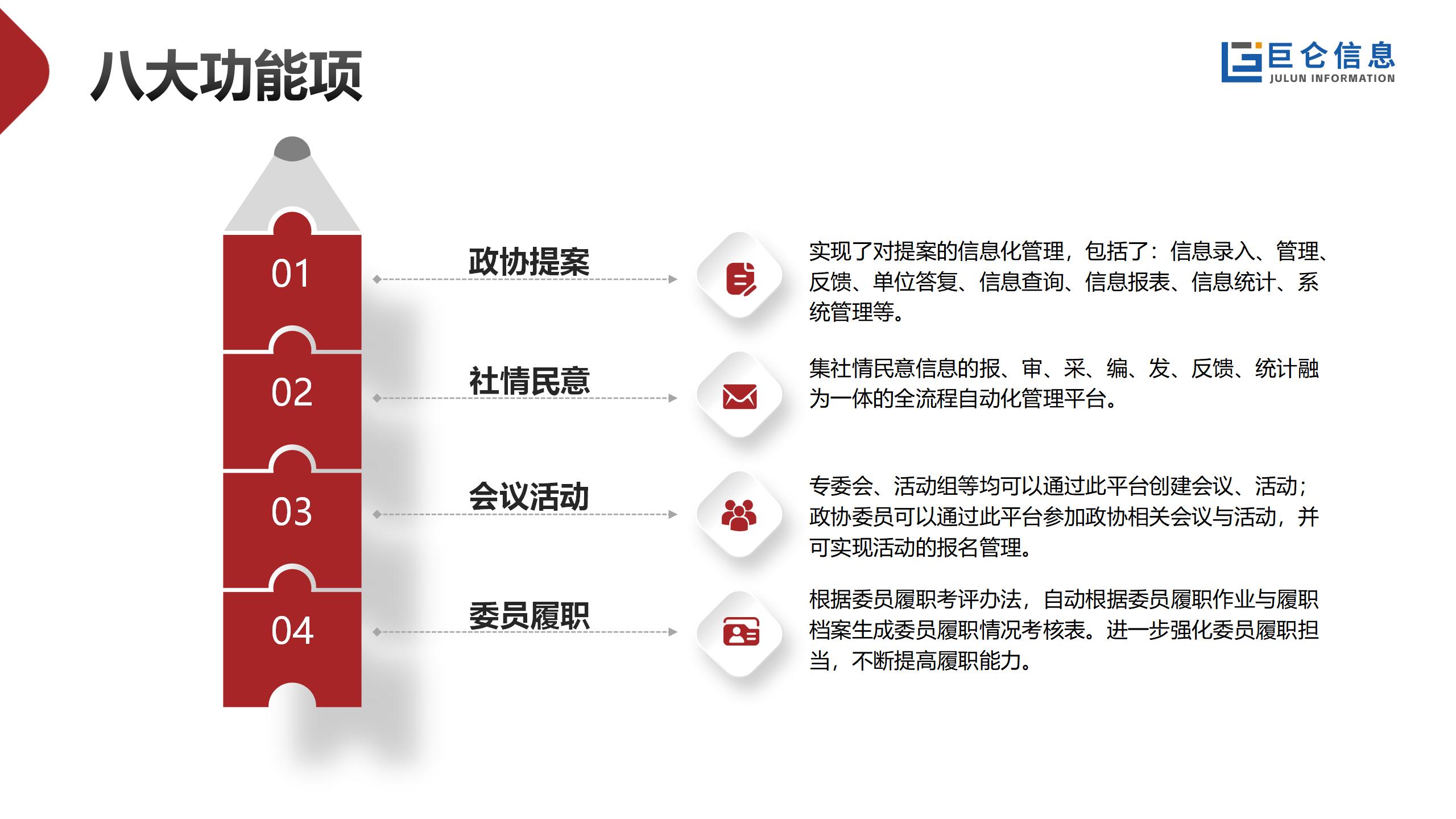 智慧政协系统是政协工作数字化核心平台,以“赋能履职、高效协商、安全可控”为核心,实现了政协委员的履职管理与政协部门的日常工作管理,为委员搭建知情明政、参政议政的新平台,全方位提升了政协工作效率与管理水平。